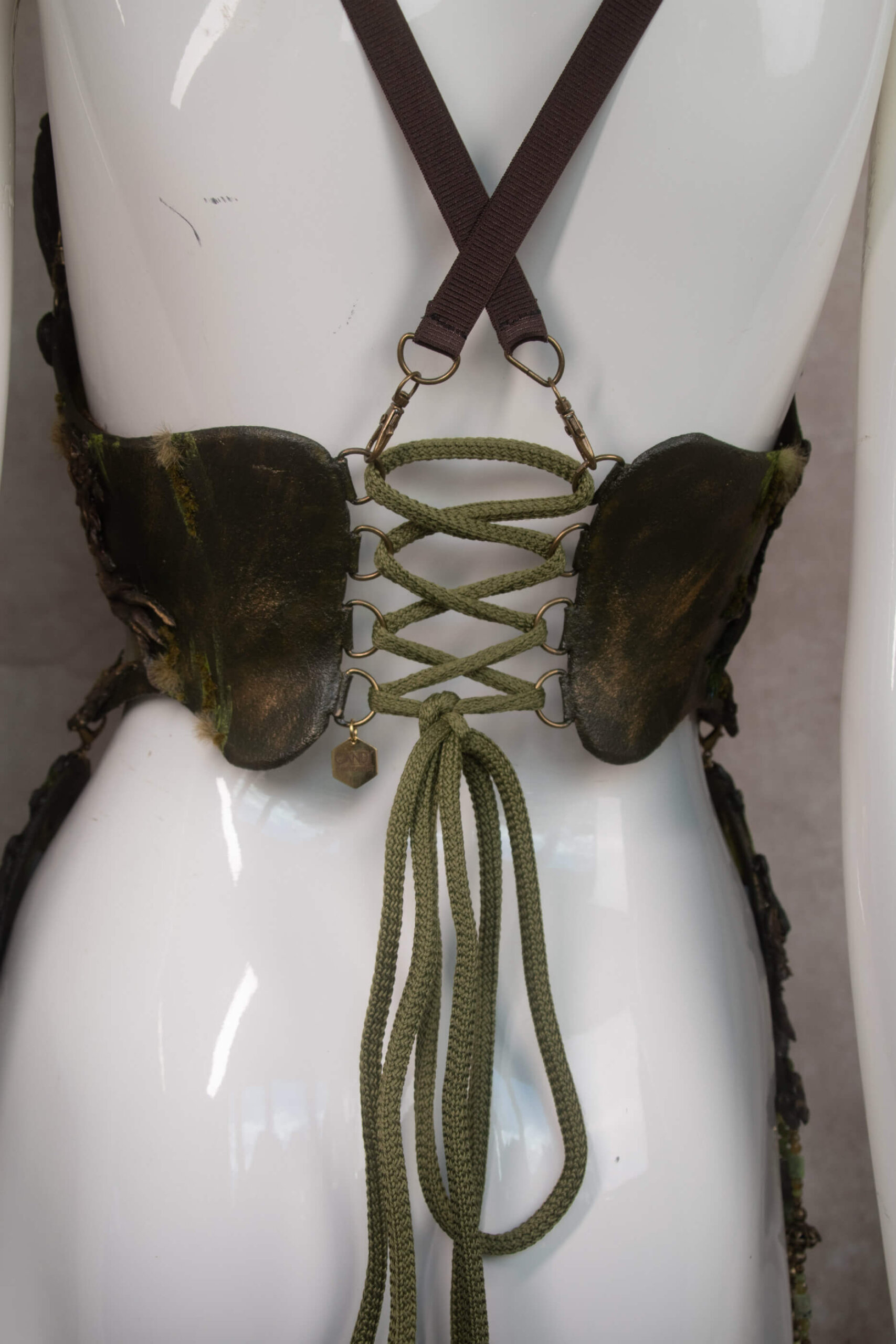 The back of the corset is to be closed/tightened by rope and the additional hip pieces are detachable.