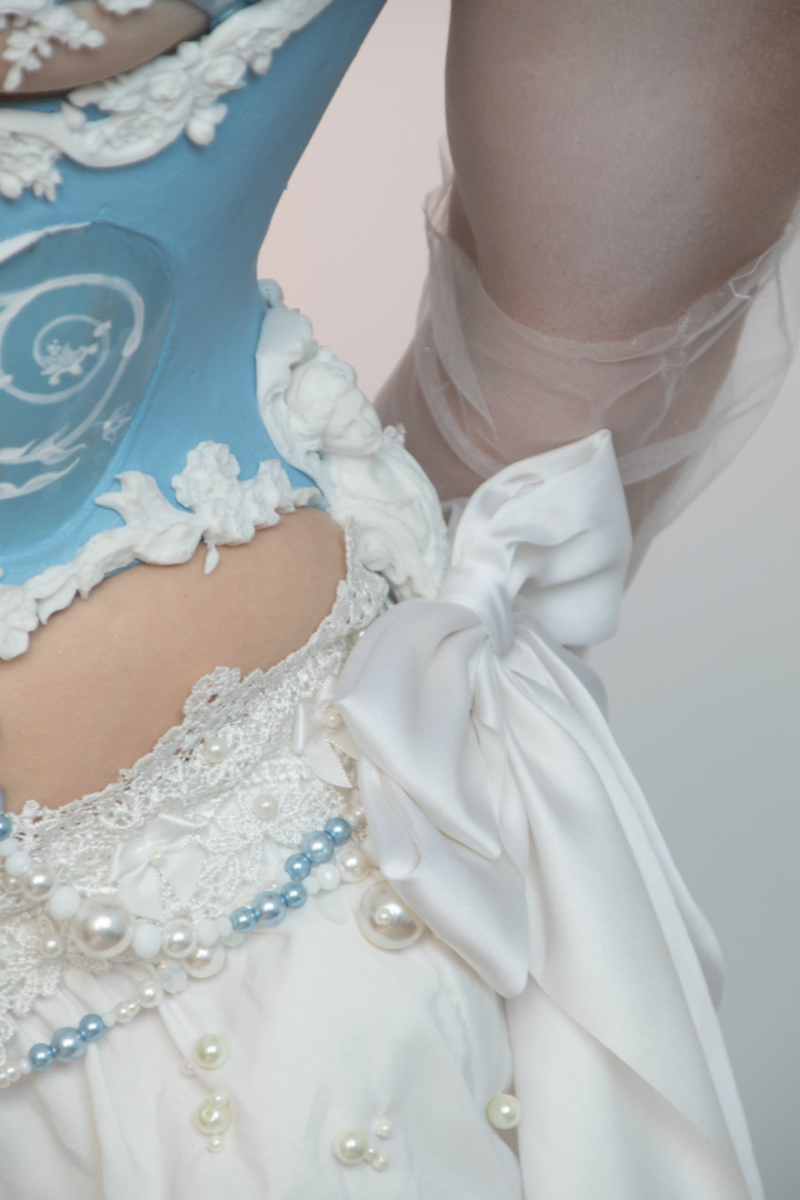 This corset is a completely handmade, sculpted, and hand-painted design, finished with intricate milky-white embellishments.